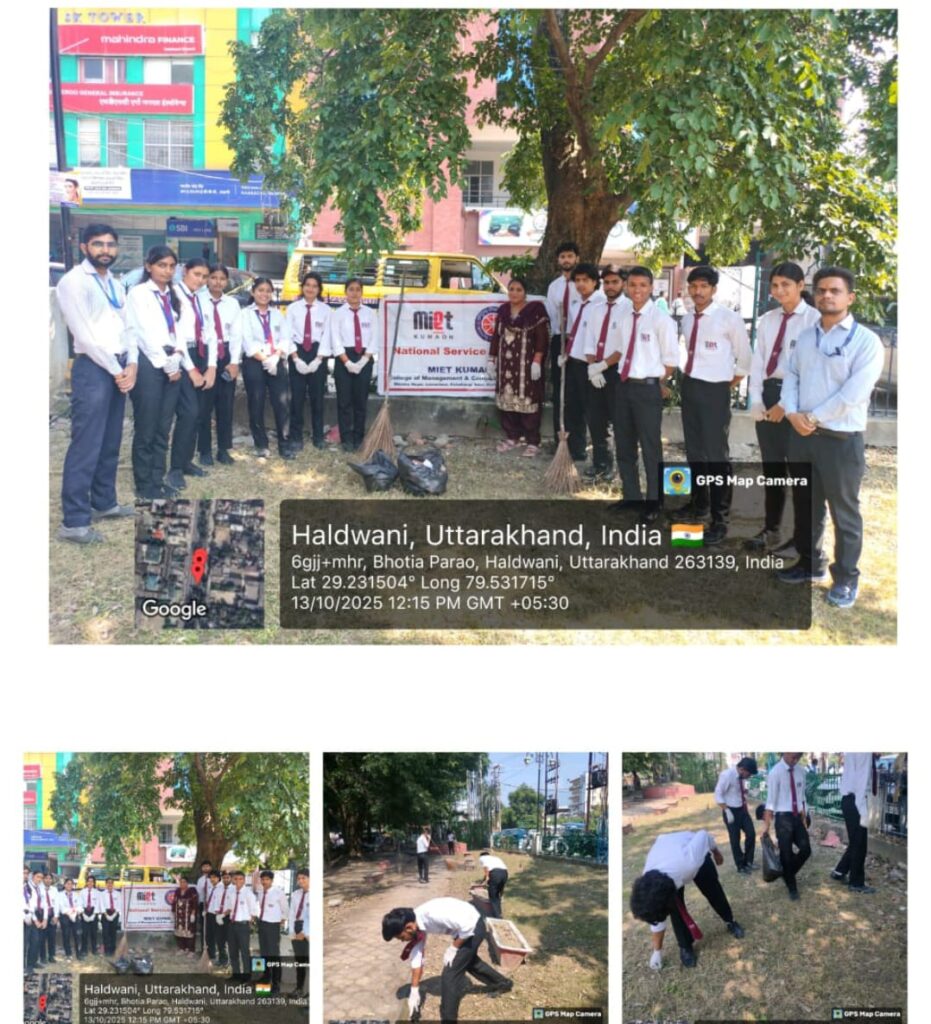 एम.आई.ई.टी. कुमाऊँ कॉलेज की एन.एस.एस. इकाई ने आज हल्द्वानी के विभिन्न स्थलों पर स्वच्छता पखवाड़ा अभियान का सफलतापूर्वक आयोजन किया। इस पहल का मुख्य उद्देश्य विद्यार्थियों और नागरिकों में स्वच्छता के प्रति जागरूकता फैलाना और स्वच्छ भारत मिशन को सशक्त बनाना था।