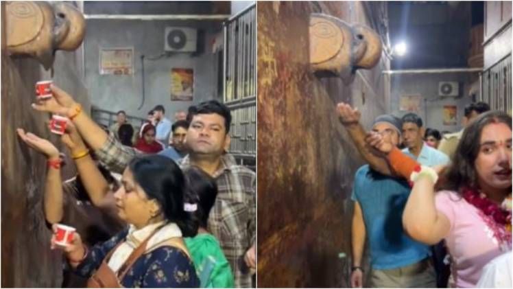 इस सच्चाई को उजागर करता एक वीडियो सामने आया है. वीडियो में दिखाया गया है कि बांकेबिहारी के मंदिर की बाहरी दीवार पर हाथी के मुंह की एक डिजाइन बनी हुई है और उसके मुंह से पानी निकल रहा है. बांकेबिहारी मंदिर आने वाले भक्त गिलास में लेकर हाथी के मुंह से निकलने वाले पानी को पी रहे हैं. उन्हें लगता है कि यह पानी कृष्ण के चरणों से आ रहा है लेकिन व्लॉगर ने खुलासा किया है कि यह कृष्ण के चरणों का नहीं बल्कि एसी का पानी है.