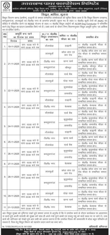 इस कार्यक्रम के तहत, आगामी 12 दिनों तक विद्युत आपूर्ति लालकुआं और हल्द्वानी के शहरी तथा ग्रामीण क्षेत्रों में प्रभावित रहेगी।