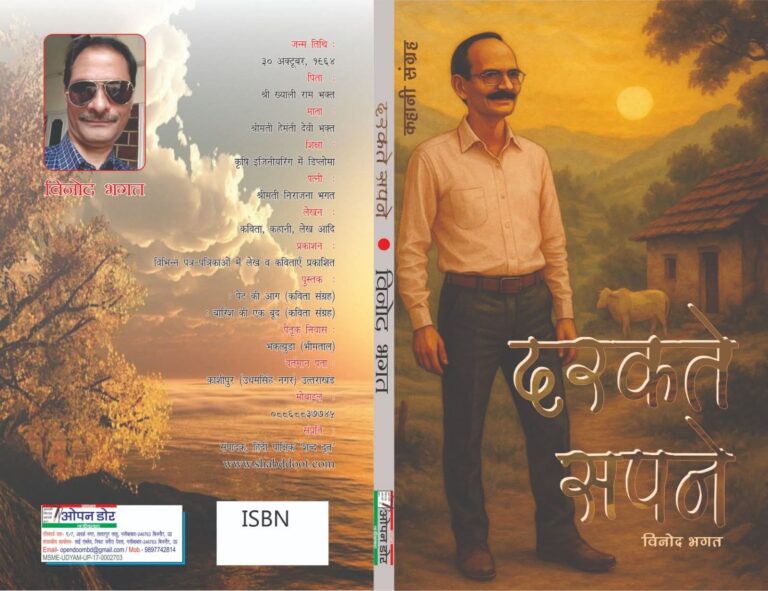 राजू अनेजा,काशीपुर। वरिष्ठ पत्रकार एवं साहित्यकार विनोद भगत ने अपनी तीसरी पुस्तक—कहानी संग्रह ‘दरकते सपने’ के साथ एक बार फिर साहित्य जगत में मजबूत उपस्थिति दर्ज कराई है। इससे पहले प्रकाशित उनकी चर्चित कृतियां ‘पेट की आग’ और ‘बारिश की एक बूंद’ पाठकों के बीच खास पहचान बना चुकी हैं, और अब ‘दरकते सपने’ ने भी साहित्य प्रेमियों में खासा उत्साह पैदा कर दिया है।