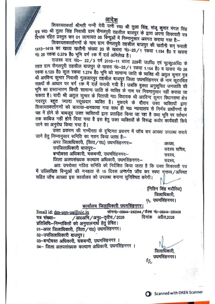 रुद्रपुर/बाजपुर (26 अप्रैल 2026): उधम सिंह नगर के जिलाधिकारी नितिन सिंह भदौरिया ने बाजपुर तहसील के ग्राम सैंमलपुरी में भूमि हस्तांतरण से जुड़े एक विवादित मामले में कड़ी कार्रवाई की है। इस मामले में गदरपुर से भाजपा विधायक अरविंद पांडे के पुत्र अतुल पांडे का नाम आने के बाद प्रशासन ने निष्पक्ष जांच के लिए एक उच्च स्तरीय समिति का गठन कर दिया है।