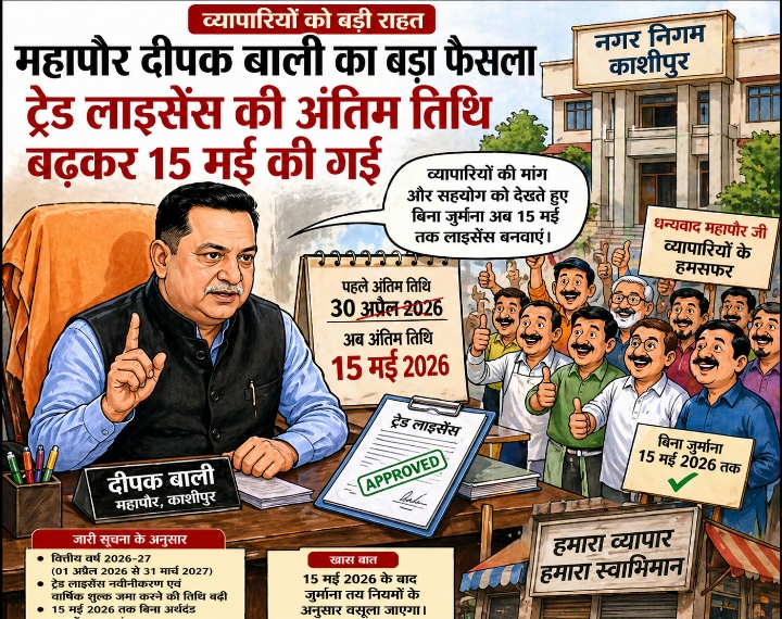 राजू अनेजा,काशीपुर। नगर निगम काशीपुर ने शहर के व्यापारियों को बड़ी राहत देते हुए एक अहम फैसला लिया है। महापौर दीपक बाली के निर्देश पर ट्रेड लाइसेंस बनवाने और वार्षिक शुल्क जमा करने की अंतिम तिथि को बढ़ा दिया गया है।