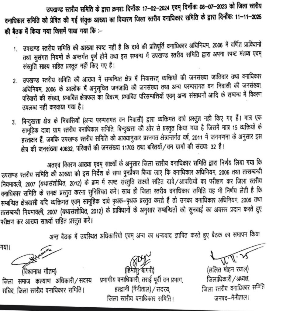 लालकुआं: वन अधिकार अधिनियम 2006 के तहत बिंदुखत्ता को राजस्व ग्राम घोषित करने के लिए किए गए सामूहिक दावों पर आज जिलाधिकारी नैनीताल की अध्यक्षता में जिला स्तरीय वनाधिकार समिति की महत्वपूर्ण बैठक आयोजित हुई। समिति ने उपखंड स्तरीय समिति द्वारा तैयार की गई रिपोर्ट पर चर्चा की और उसमें स्पष्टता की कमी बताते हुए तीन बिंदुओं पर तत्काल स्पष्टीकरण माँगा है।