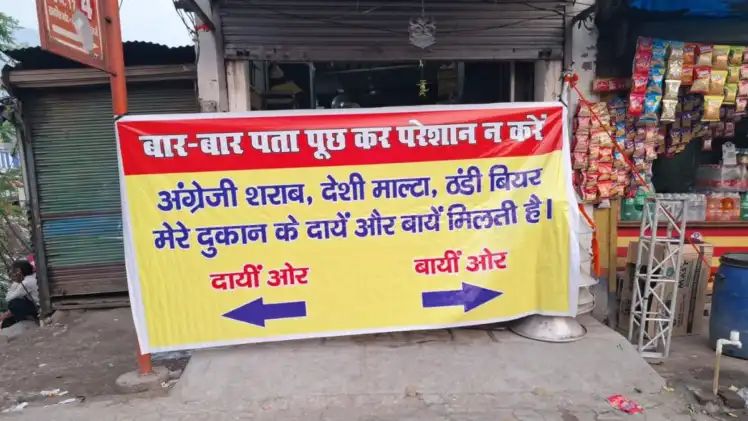 “बार-बार पूछताछ कर परेशान न करें, दुकान के दायें और बायें मिलती है शराब (अंग्रेजी, देसी और बीयर)।”
