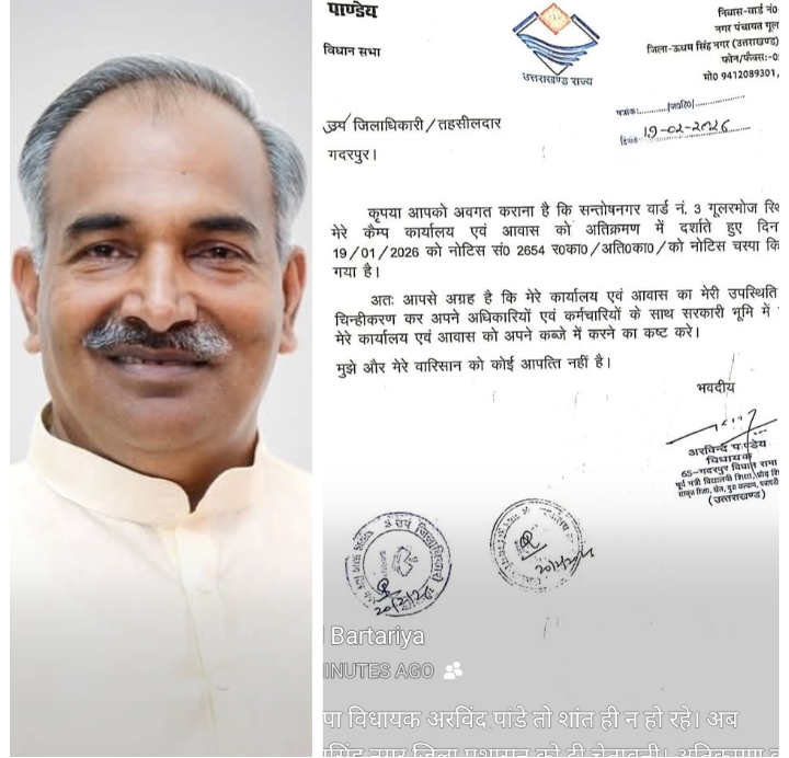 मामला सन्तोषनगर वार्ड नं. 3, गूलरभोज स्थित उनके कैम्प कार्यालय एवं आवास से जुड़ा है। 19 जनवरी 2026 को तहसील प्रशासन, गदरपुर, की ओर से नोटिस चस्पा कर परिसर को अतिक्रमण में दर्शाया गया था। लेकिन तय समयसीमा के भीतर कार्रवाई न होना अब चर्चा और सवालों का केंद्र बन गया है।