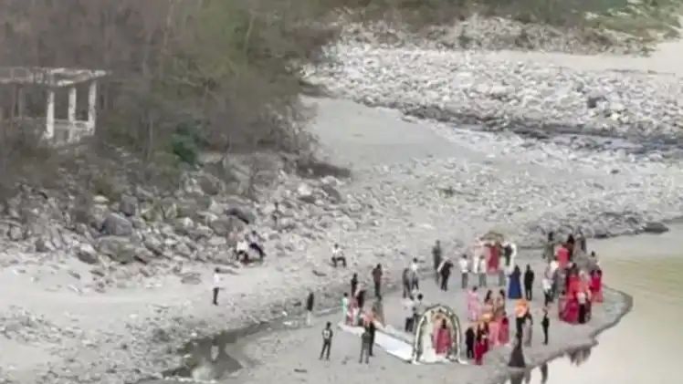 अल्मोड़ा/मर्चूला (27 अप्रैल 2026): उत्तराखंड को ‘डेस्टिनेशन वेडिंग हब’ बनाने की सरकार की कोशिशों के बीच अल्मोड़ा के मर्चूला में एक चौंकाने वाला मामला सामने आया है। यहाँ रामगंगा और बदनगढ़ नदी के संगम पर स्थित एक प्राचीन अंत्येष्टि स्थल (श्मशान घाट) पर विवाह समारोह का आयोजन किया गया। जिस स्थान पर इंसान की अंतिम यात्रा संपन्न होती है, वहाँ नवविवाहित जोड़े द्वारा जीवन की नई शुरुआत करने का वीडियो वायरल होने के बाद सोशल मीडिया पर आक्रोश फूट पड़ा है।