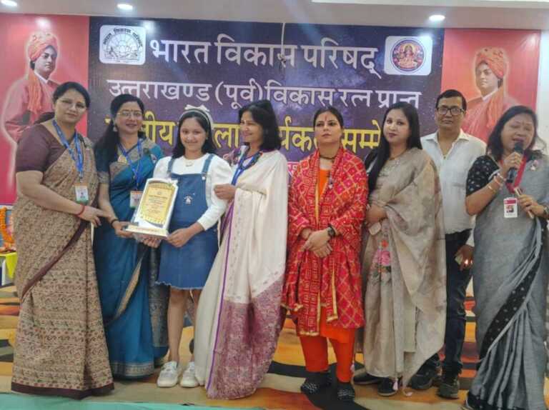 लालकुआं/काशीपुर (8 मार्च 2026): भारत विकास परिषद द्वारा आयोजित राज्य स्तरीय ऑनलाइन सांस्कृतिक प्रतियोगिता में लालकुआं की आरवी अग्रवाल ने प्रथम स्थान प्राप्त कर अपनी बहुमुखी प्रतिभा का लोहा मनवाया है। आज महिला दिवस के पावन अवसर पर काशीपुर में आयोजित एक भव्य समारोह में उन्हें इस उपलब्धि के लिए विशेष रूप से सम्मानित किया गया।