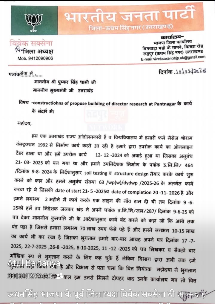 राजू अनेजा,ऊधमसिंह नगर। पंतनगर विश्वविद्यालय में ठेका कार्य को लेकर बड़ा विवाद खड़ा हो गया है। भाजपा के पूर्व जिलाध्यक्ष व उत्तराखंड राज्य आंदोलनकारी विवेक सक्सेना ने मुख्यमंत्री पुष्कर सिंह धामी को पत्र भेजकर विश्वविद्यालय प्रशासन पर गंभीर उत्पीड़न का आरोप लगाया है। उन्होंने चेतावनी दी है कि यदि शीघ्र न्याय नहीं मिला तो वह आत्मदाह जैसा कठोर कदम उठाने को मजबूर होंगे।