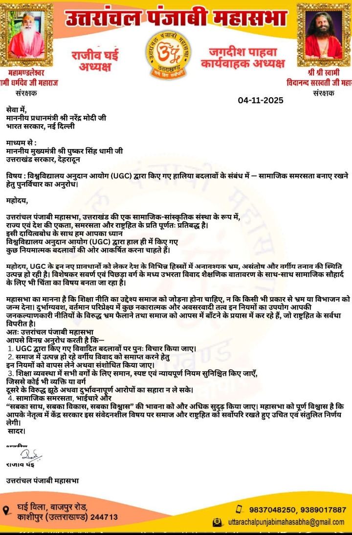 रुद्रपुर/देहरादून।उत्तरांचल पंजाबी महासभा ने विश्वविद्यालय अनुदान आयोग (UGC) द्वारा हाल ही में किए गए नियमात्मक बदलावों को लेकर गहरी चिंता जताई है। महासभा ने इन परिवर्तनों को सामाजिक समरसता और शैक्षणिक सौहार्द के लिए चुनौतीपूर्ण बताते हुए माननीय प्रधानमंत्री श्री नरेंद्र मोदी को ज्ञापन प्रेषित कर पुनर्विचार का अनुरोध किया है। यह ज्ञापन माननीय मुख्यमंत्री श्री पुष्कर सिंह धामी के माध्यम से भेजा गया।