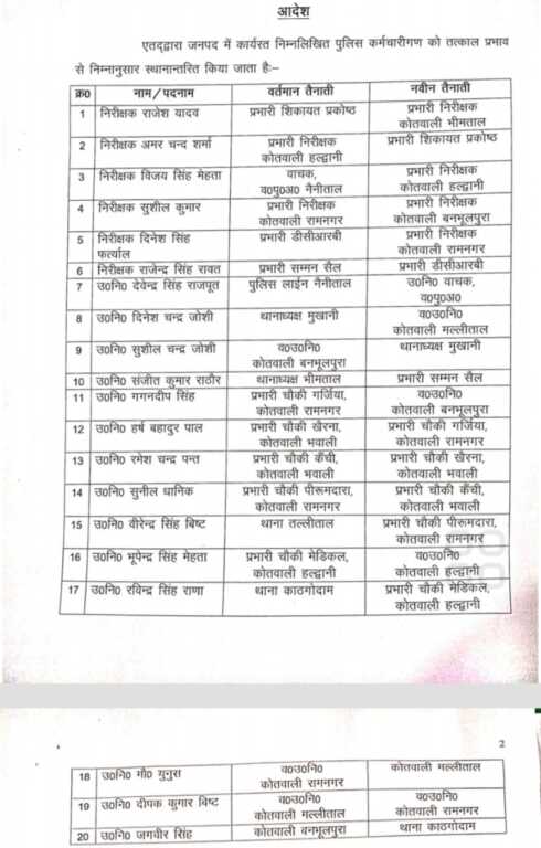 | 12 | उपनिरीक्षक हर्ष बहादुर पाल | प्रभारी चौकी खेरना, कोतवाली भवाली | प्रभारी चौकी गंजिया, कोतवाली रामनगर |