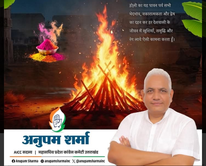 राजू अनेजा, काशीपुर। कांग्रेस पार्टी के प्रदेश महासचिव अनुपम शर्मा ने समस्त क्षेत्रवासियों को रंगों के महापर्व होली की हार्दिक शुभकामनाएं दीं।