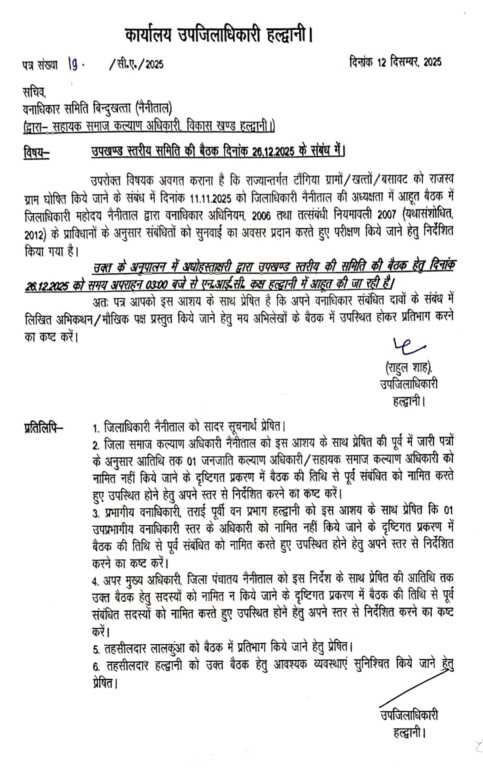 उपजिलाधिकारी हल्द्वानी राहुल शाह द्वारा वनाधिकार समिति, बिन्दुखत्ता के सचिव को बैठक में शामिल होने के लिए पत्र जारी किया गया है।