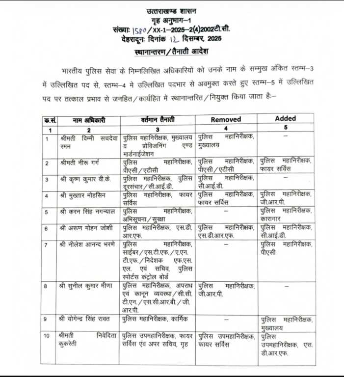 देहरादून: उत्तराखंड में भारतीय पुलिस सेवा (IPS) के अधिकारियों का बड़े पैमाने पर तबादला हुआ है। मुख्यमंत्री पुष्कर सिंह धामी की सरकार ने राज्य में 15 आईपीएस अधिकारियों को इधर-उधर किया है, जिसमें 6 आईजी, एक डीआईजी और तीन पुलिस अधीक्षक रैंक के अधिकारी शामिल हैं।