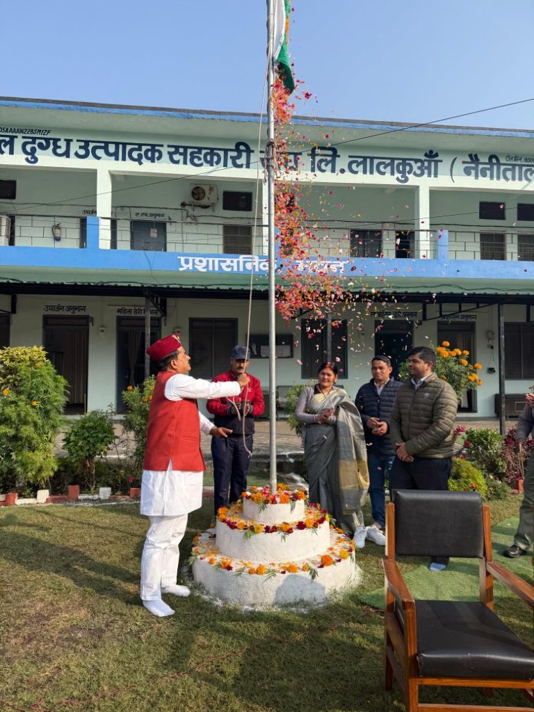 लालकुआं (नैनीताल): नैनीताल दुग्ध उत्पादक सहकारी संघ लिमिटेड के प्रशासनिक भवन प्रांगण में गणतंत्र दिवस का पर्व हर्षोल्लास के साथ मनाया गया। संघ के अध्यक्ष मुकेश बोरा ने ध्वजारोहण कर तिरंगे को सलामी दी। इस अवसर पर पूरा परिसर ‘भारत माता की जय’ और ‘वन्दे मातरम’ के नारों से गुंजायमान रहा।